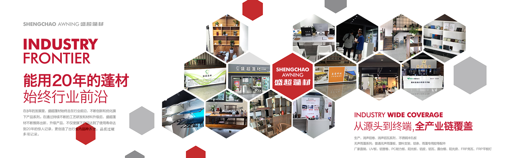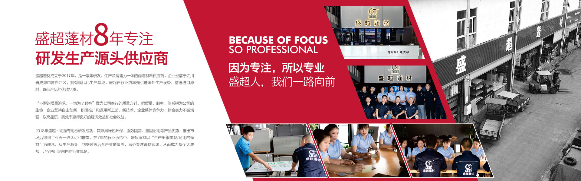 盛超蓬材是由四川超諾商貿(mào)有限公司創(chuàng)辦,是一家集研發(fā)、生產(chǎn)、銷售和服務(wù)于一體的專業(yè)雨蓬供應(yīng)商。主要產(chǎn)品:實(shí)心耐力板,中空陽光板、多層板、蜂窩板、鋁瓦、消聲鋁瓦、不銹鋼消聲等材料的雨蓬產(chǎn)品。自主研發(fā)多款雨蓬,擁有自己的專利和檢測報(bào)告。其中明星產(chǎn)品新型組裝式雨蓬,擁有組裝簡便,美觀耐用、抗噪音,性價(jià)比高等優(yōu)勢,多項(xiàng)檢測指標(biāo)領(lǐng)跑同行業(yè)。受到了市場和經(jīng)銷商的高度認(rèn)可。 公司自成立至今,從銷售到研發(fā)再到生產(chǎn),已經(jīng)過了3次跨越式的發(fā)展。2017年已成為四川雨蓬行業(yè)內(nèi)庫房面積大,員工多的一家公司。產(chǎn)值每年以平均20%的速度快速增長。可以說客戶是我們的老師,和他們合作使我們得到很多的學(xué)習(xí)機(jī)會來提高自身的技術(shù)水平和管理水平,是我們生產(chǎn)和發(fā)展的動力。